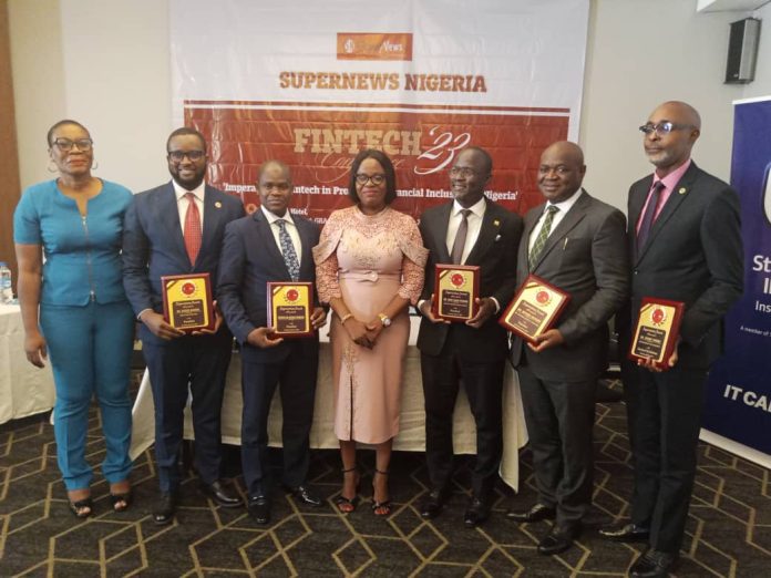 L-R: The President, Guild of Corporate Online Publishers (GOCOP), Ms Maureen Chigbo; The Head of Investment and Research, Parthian Partners, Mr. Seun Dosunmu representing the Group CEO of Parthian, Mr. Oluseye Olusoga; the Director, Registration, Exchange, Market Infrastructure and Innovation Department, Securities and Exchange Commission (SEC), Mr Abdulkadir Abbas representing the Director- General/CEO of SEC, Dr Lamido Yuguda; Publisher/CEO of SUPERNEWS Nigeria, Ms Ngozi Onyeakusi; Business Development Manager, Premium Pension, Mr. Adedayo Quadri representing the Managing Director, Mr Umar Sanda Mairami; Managing Director Tangerine General Insurance, Mr. Mayowa Adeduro and Deputy Director, National Insurance Commission (NAICOM), Mr. Ajibola Bankole representing the Commissioner for Insurance/CEO of NAICOM, Mr. Sunday Thomas at the SUPERNEWS Nigeria Fintech 2023 Conference held in Lagos recently.